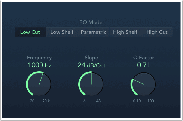 Der Single Band EQ verfügt im Vergleich zu den anderen Equalizern von Logic Pro über die wenigsten Klangparameter, ist jedoch auch am einfachsten in der Handhabung. Zur Klangbearbeitung steht lediglich ein einzelnes Band mit drei Parametern zur Verfügung: Frequenz, Gain (bei Shelf- und Parametric-Filtern) bzw. Slope (bei Low-Cut und High-Cut-Filtern) und Q-Faktor.