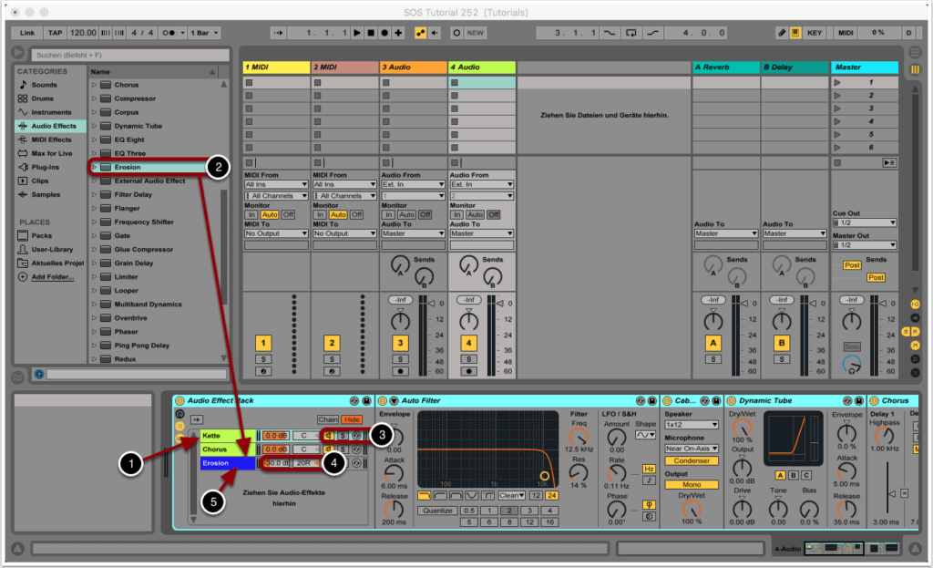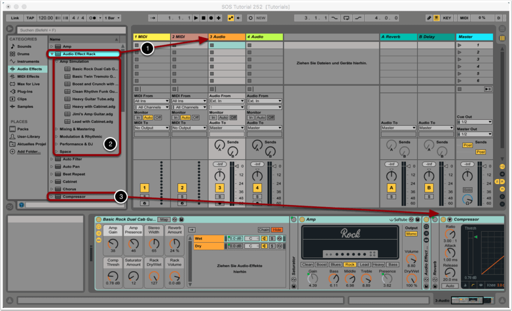 Effekte kannst du ebenfalls per Drag&Drop aus dem Geräte-Browser in das dafür vorgesehene Feld des Racks ziehen (3).