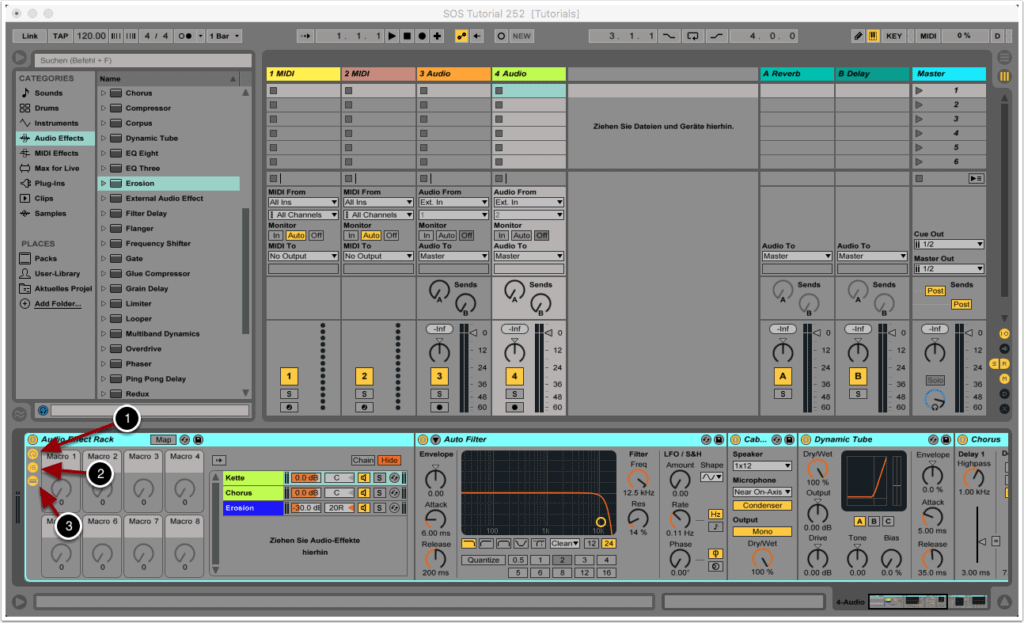 In der Abbildung siehst du ein Beispiel für eine Gerätekette, die zahlreiche Audio Effects enthält: Auto Filter, Cabinet, Dynamic Tube, Chorus und Gate. Alle diese Geräte kannst du als Rack zusammenfassen, verknüpfen und gemeinsam verwalten. Ein besonders mächtiges Tool von Racks sind Makro-Regler, mit denen du eine beliebige Anzahl von Parametern von Geräten, die sich im gleichen Rack befinden, ansteuern kannst. Ein ausführliches Tutorial zum Thema Makro-Regler wird folgen.