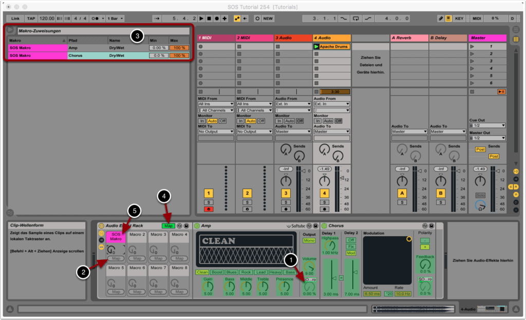 In unserem Beispiel haben wir den Dry-/Wet-Regler von Amp sowie den Dry-/Wet-Regler von Chorus Makro 1 zugeordnet. Der Zuweisungs-Browser gibt dir eine Übersicht über das Mapping (3).