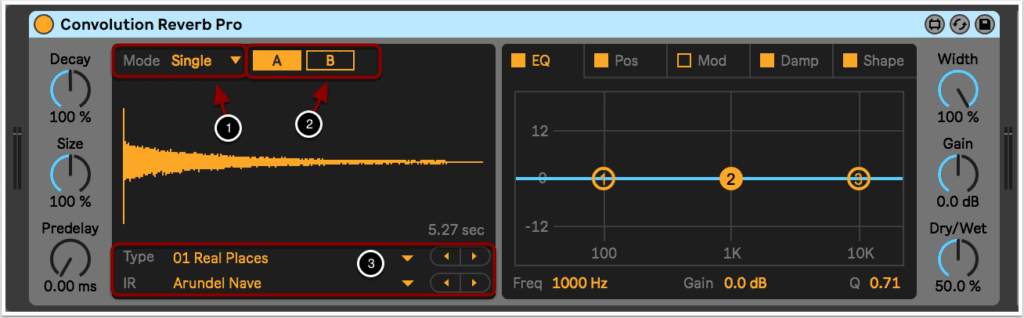 In der Pro-Version kannst du zwei unterschiedliche Impulsantworten in die Engine laden, die je nach IR-Modus unterschiedlich verwendet werden. Über das kleine Drop-Down-Menü kannst du zwischen beiden Modi switchen (1):