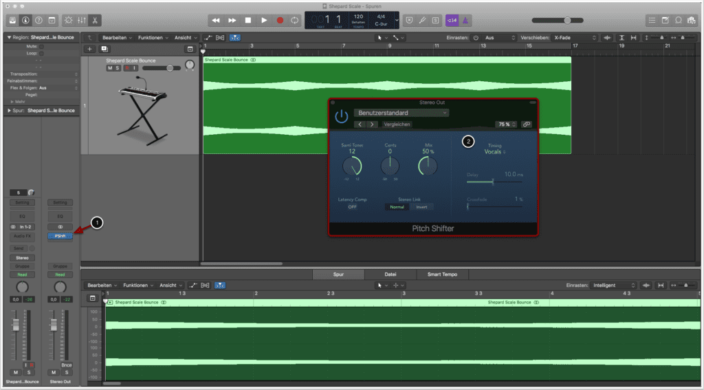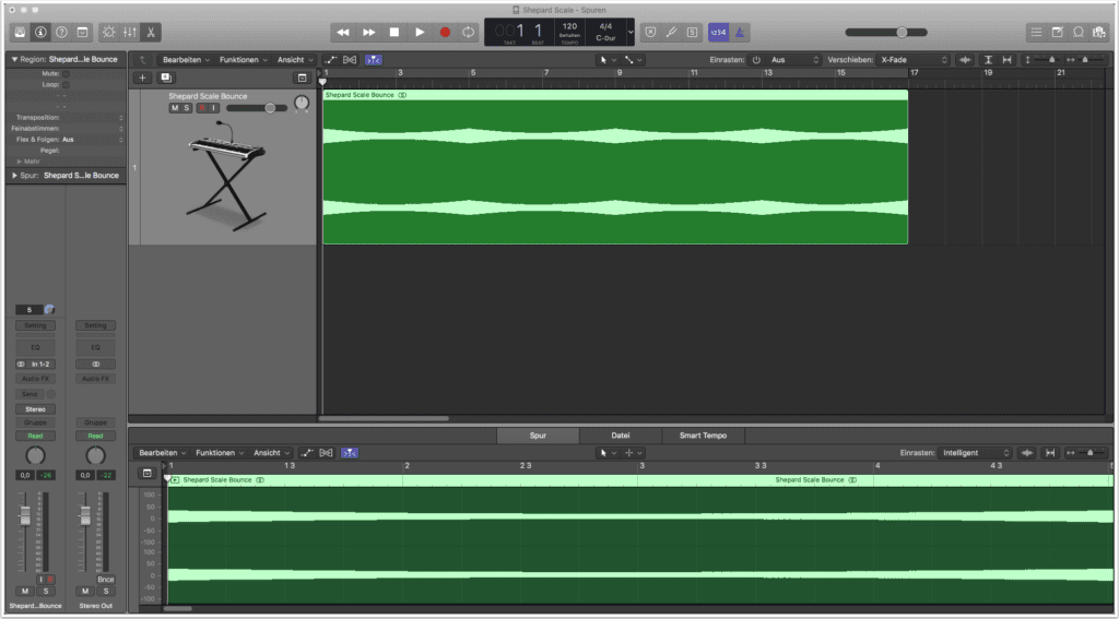 Im ersten Teil haben wir uns mit der Klangsynthese (Klangbeispiel 01) befasst. In diesem Teil verwenden wir eine Reihe von Audio-Effekten, mit denen wir den Shepard-Ton interessanter gestalten wollen (Klangbeispiel 02). In beiden Teilen benutzen wir ausschließlich Instrumente und Werkzeuge von Logic Pro X.