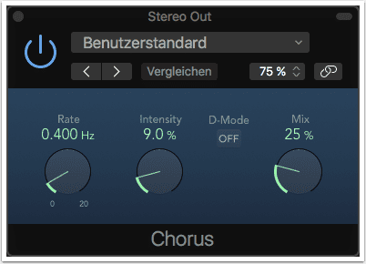 Bringe die Modulationsgeschwindigkeit auf 0.4 Hz, reduziere die Intensität auf 9% und setzte das Dry-/Wet-Verhältnis auf 25%.