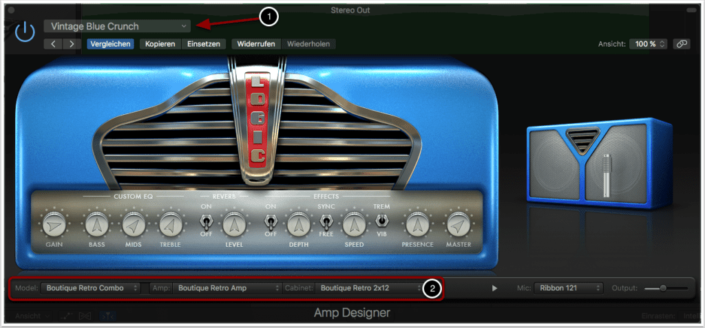 Als Cabinet verwenden wir „Boutique Retro 2×12“, womit wir gleichzeitig auch das Model zu „Boutique Retro Combo“ ändern (2).