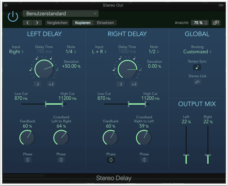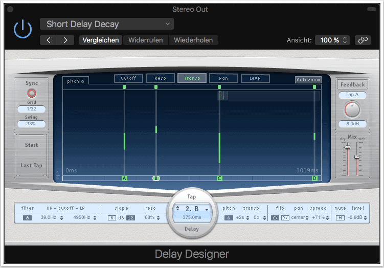 Als Ausgangsbasis haben wir das Warped-Preset „Short Delay Decay“ benutzt, welches wir der Abbildung entsprechend leicht modifiziert haben. Natürlich kannst du die Delay-Einstellungen auch hier deinem eigenen Geschmack anpassen.