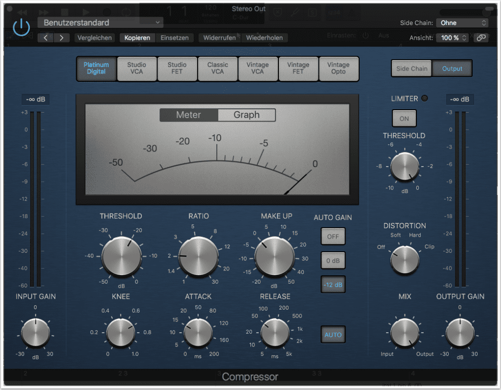 Wir haben dafür auf den Kompressor von Logic zurückgegriffen und das Benutzerstandard-Preset verwendet. Passe bei Bedarf den Threshold-Regler für mehr oder weniger Kompression an.