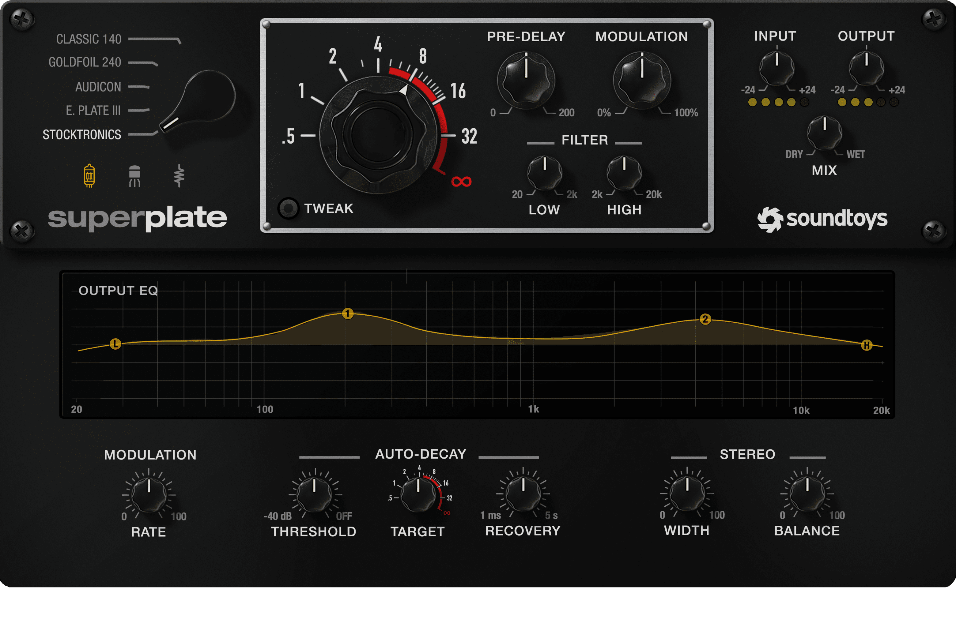SuperPlate emuliert den Klangcharakter von fünf klassischen elektromechanischen Plattenhallgeräten: EMT 140, EMT 240, Audicon, EcoPlate III und Stocktronics RX4000. Für eine analoge Klangfärbung stehen drei verschiedene Modi zur Verfügung: Tube, Solid-State und Clean. Die Varianten „Tube“ und „Solid State“ sind dem EMT V54 Vorverstärker für Röhrensättigung und dem EMT 162 Vorverstärker nachempfunden, der über einen eingebauten Kompressor zur Zähmung von Transienten verfügt. SuperPlate enthält außerdem eine Reihe moderner digitaler Funktionen, darunter eine unendliche Abklingzeit, ein eingebautes Pre-Delay, erweiterte Modulationsregler, einen vollwertigen EQ für eine detaillierte Klangformung und eine innovative Decay-Ducking-Option.