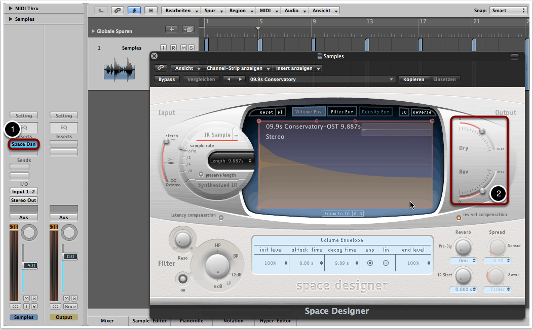 Wir wählen ein Setting aus mit einer sehr langen Nachhallzeit (z.B. Large Spaces -> Halls -> Conservatory) und bringen den Reverb-Anteil bzw. das Wet-Signal auf den selben Wert wie das Dry-Signal (2). Das Dry-/Wet-Verhältnis muss nicht unbedingt 50/50 sein, doch sollte der Reverb-Anteil ziemlich hoch sein und den Dry-Anteil eher überwiegen als darunter liegen. Selbst ein Wet-Signal von 100%, ohne Dry-Anteil, kann unter Umständen gut klingen.
