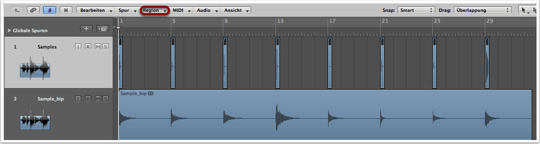 Wir erstellen aus unseren Samples und dem Reverb eine neue Audiofile. In Logic Pro geht das, indem wir alle Samples markieren und über den Menüpunkt “Region” -> “Regionen bouncen auf Festplatte” auswählen. In dem Feld “Effekt-Plug-Ins umgehen” darf kein Haken sein, da ansonsten der Reverb nicht auf die neue Audiodatei übertragen werden würde. Logic erstellt im Anschluss automatisch eine neue Spur, auf der die neue Audiofile zu sehen ist.