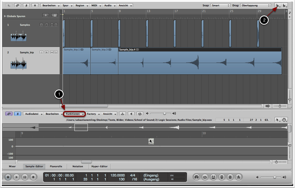 Durch einen Doppelklick auf die neue Audiofile gelangen wir zum Sample-Editor. Hier wählen wir unter “Funktionen” -> “Rückwärts” aus, woraufhin unsere neu erstellte Audiofile invertiert wird (1). Beim Abspielen können wir nun den charakeristischen Reverse-Sound vernehmen, den wir für unsere Lead-Ins benötigen.