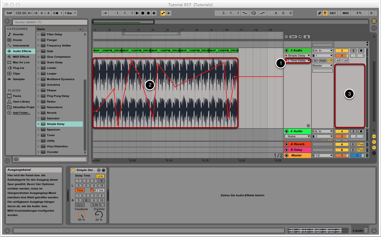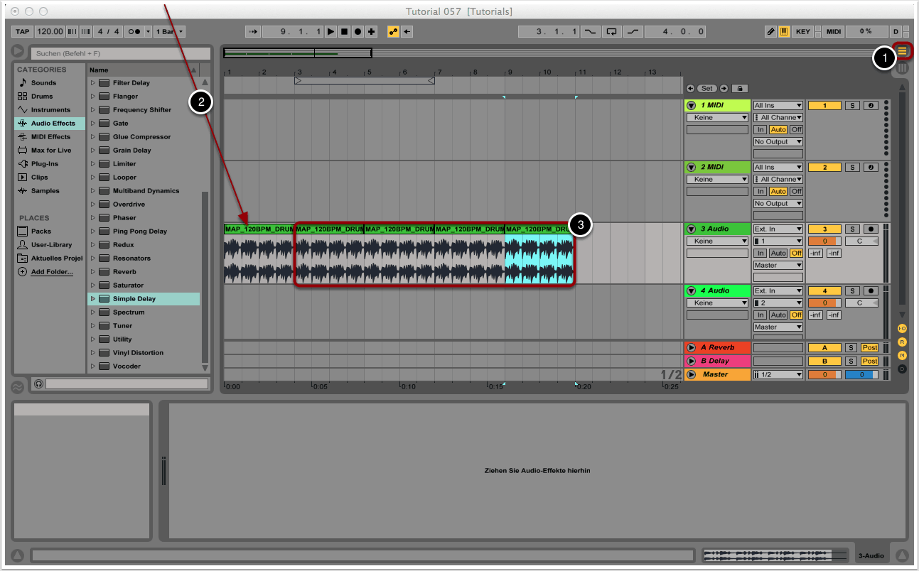 In Tutorial 008 haben wir den Effekt mit Logic Pro verwirklicht. In diesem Tutorial wollen wir ein ähnliches Ergebnis mit Ableton Lives Simple Delay erzielen.