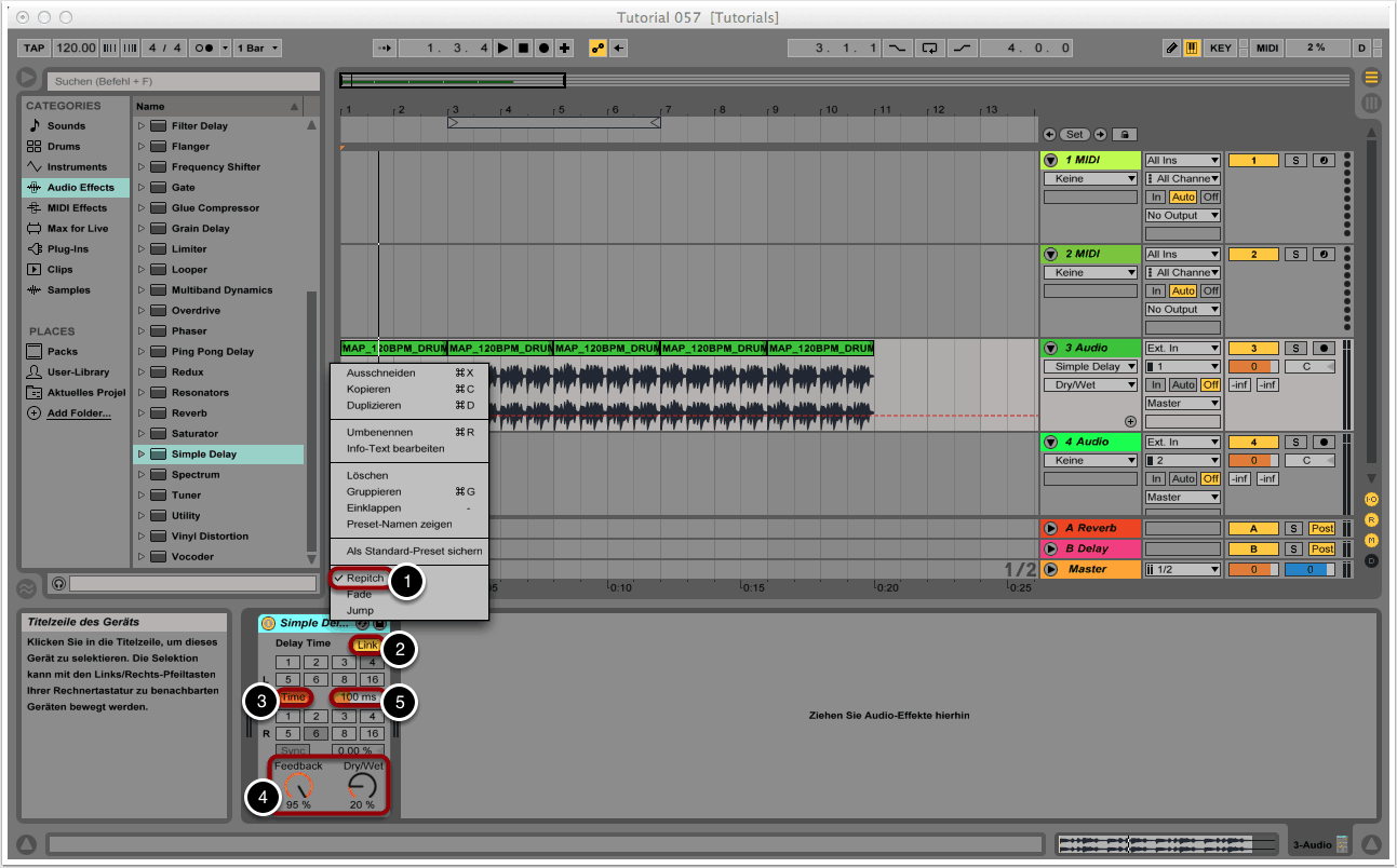 Der Pitch-Shift-Effekt entsteht nun, indem wir in Echtzeit, d.h. während des Abspielens des Drum Loops, die Delay Time verändern (5).